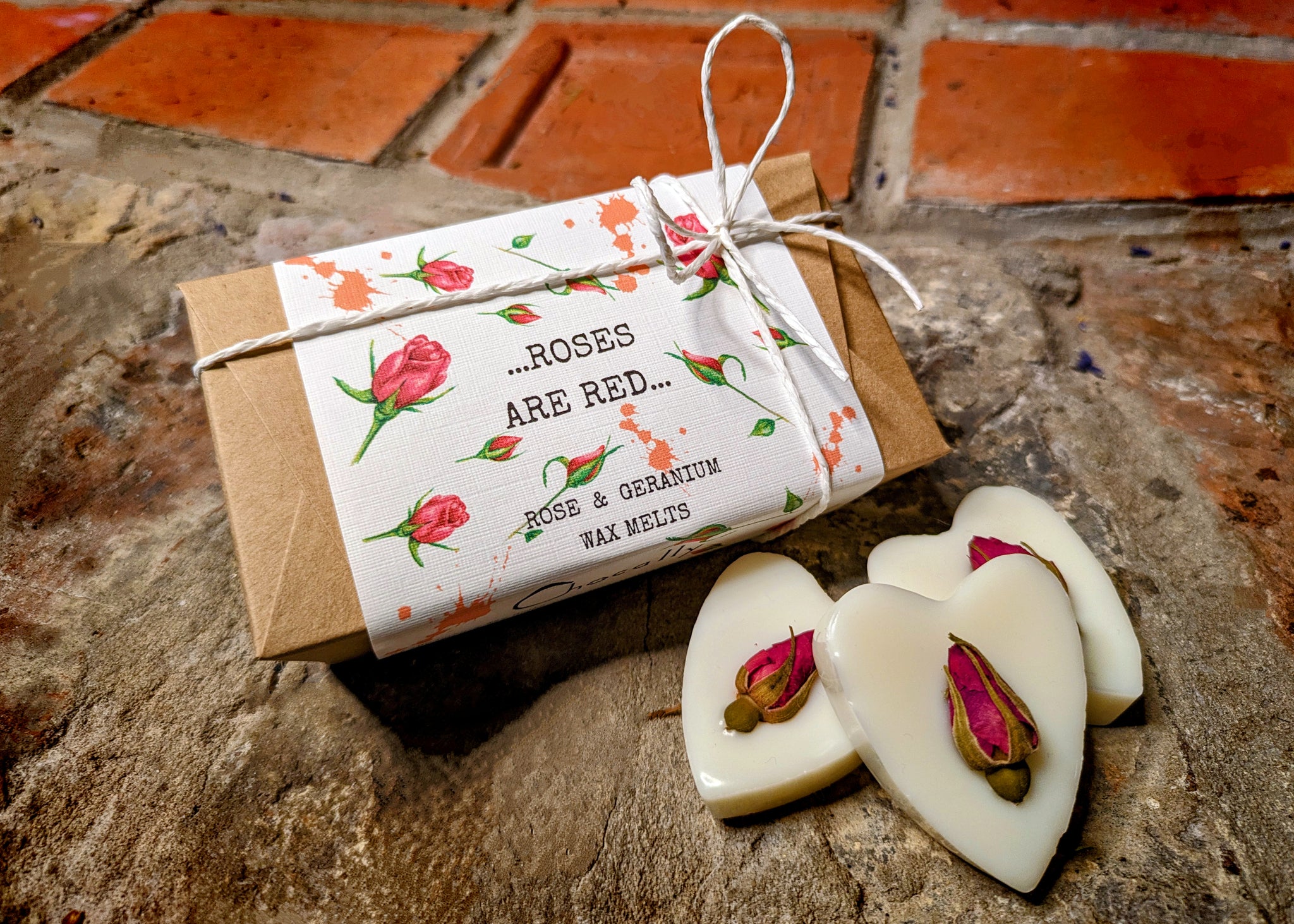 Here is a box of rose and geranium heart shaped wax melts, one of my trio of special romantic scents for the one you love.